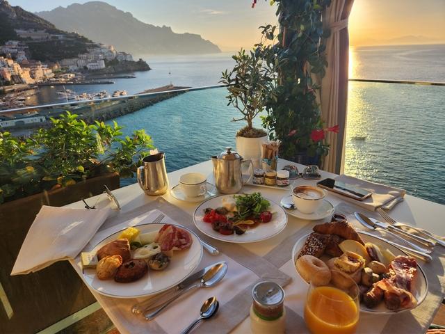 또한 테라스도 있어서, 아침마다 일출을 볼 수 있었구요, 조식도 맛있고, 조식장 뷰가.....진짜 예술이었습니다. 그리고 호텔에는 아말피 시내까지 나가는 셔틀도 있어서(걸어서도 10분~15분 거리밖에 안될 만큼 가까워요), 여행 시 피곤이 덜했습니당 :)