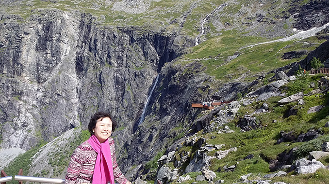 오슬로에서 뮈르달로 가서 플롬 행 산악열차를 타고 깎아지른 듯한 계곡을 굽이굽이 내려 가보니 왜 이 산악열차가 유명한 지를 실감할 수 있었다. 도중에 폭포 앞에 모두 내려 사진을 찍게 해주었다.