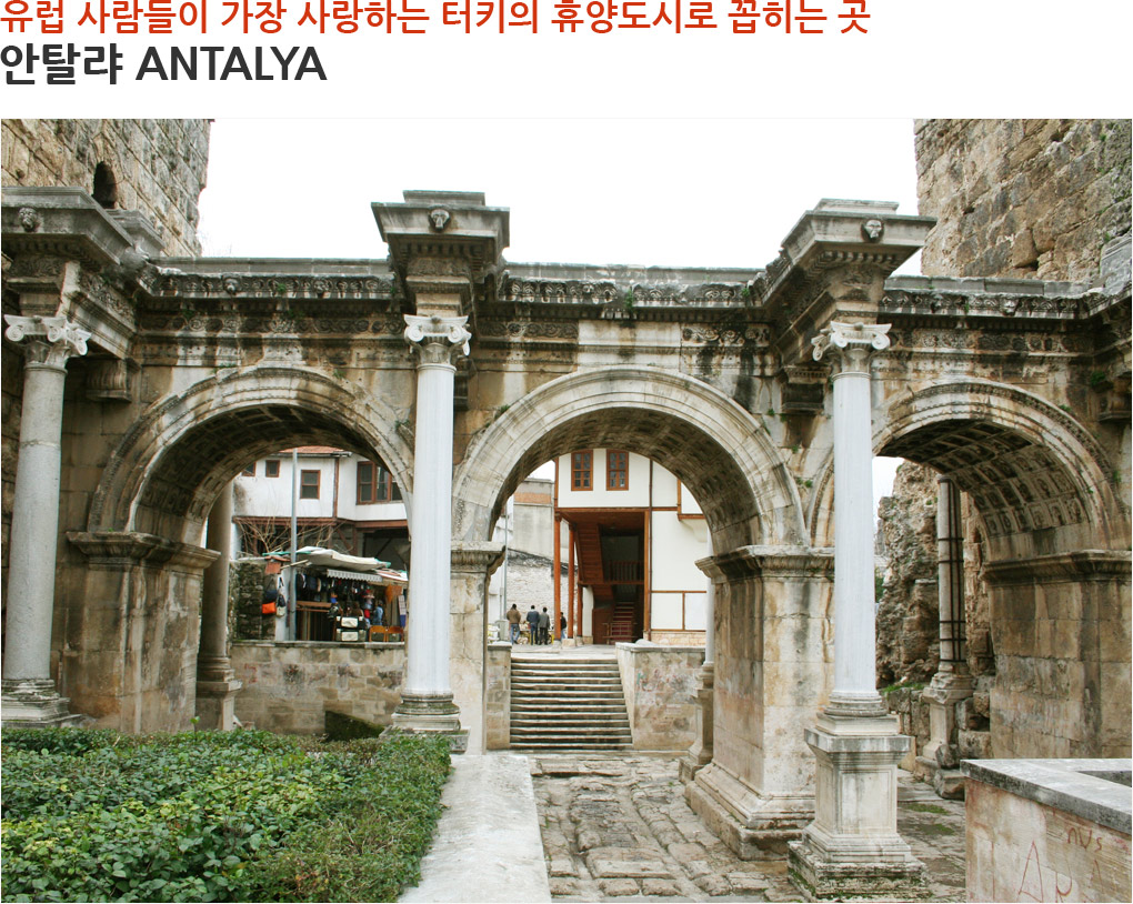 터키의 지중해 연안에 위치한 안탈랴는 연중 일조량이 300일이 넘고 강수량이 적어 휴양지로서 최상의 조건을 지니고 있는 도시이다. 특히 유럽 사람들이 가장 사랑하는 터키의 휴양도시로 꼽히는 곳이기도 하다. 해안을 따라 황금 빛 모래사장으로 이루어진 해변 주변으로 최고급 리조트들이 늘어서 있고 지중해 바다에서는 다양한 해양 스포츠를 즐길 수도 있다. 안탈랴가 사랑 받는 이유는 단지 놀 거리 때문만은 아니다. 도시 곳곳에서 볼 수 있는 셀주크, 오토만의 유적들을 통해 문화와 역사를 접할 수 있을 뿐만 아니라 근교에 페르게, 아스펜도스와 같은 위대한 유적지들도 둘러볼 수 있기 때문이다.
